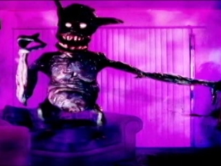 The ending has the realtor and his wife showing the house, only for 2D Satan to pop out, and kill everyone by pointing at them, which causes heads to fly off of bodies, He does this while squatting on the chair. You know, as the Lord of Darkness is prone to do. "Hey, I'm going to kill you all, but let me grunt a stinking mud-grenade on your couch. That'll really torment your soul!" Captain Conspiracy then bombs the house. The movie ends showing us the puppets they used to achieve their masterful effects. You know, just in case we were traumatized by the realism of them.